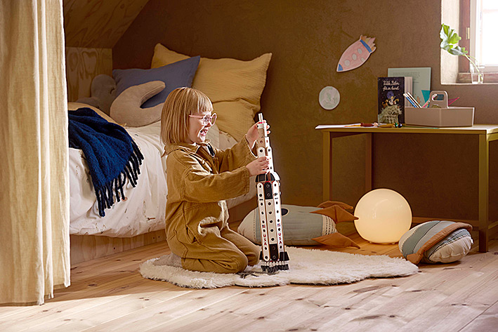 Drei Stufen Power mit blinkender Raketenspitze haben ein Ziel: den Mond. Mit dem kindgerechten Werkzeug, darunter Zange und Schraubenschlüssel, wird geschraubt, gebaut und ausprobiert – ganz wie bei den Großen. Beim Zusammensetzen der drei Raketenteile werden logisches Denken und Problemlösekompetenz gefördert – und ganz nebenbei der Grundstein für Technikbegeisterung gelegt.