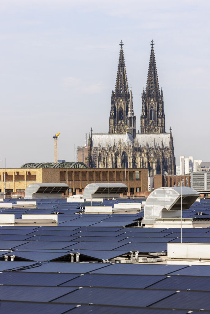 Grüner Strom vom Hallendach: Seit 2024 betreibt die Koelnmesse die größte innerstädtische Photovoltaik-Anlage Kölns, mit 20.000 Quadratmetern Gesamtfläche und einer jährlichen Kapazität von drei Millionen Kilowattstunden.