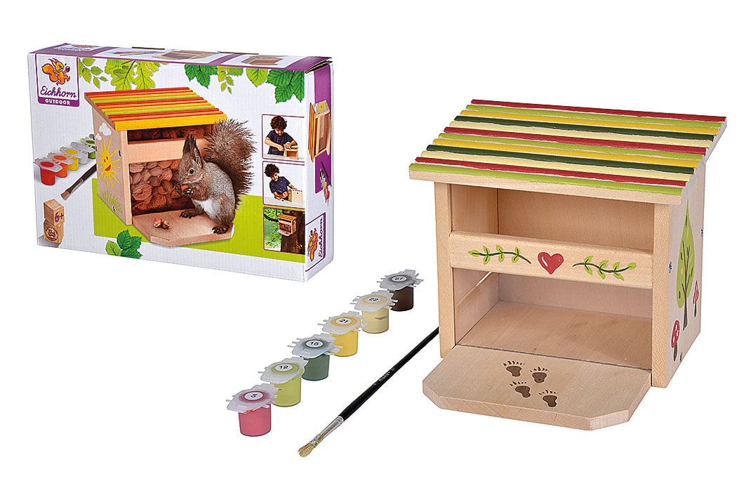 Die Eichhorn Kreativspielzeuge begeistern Groß und Klein mit einfallsreichen Bastelartikeln. Zum Beispiel kann man Eichhörnchen eine Freude machen mit dem neuen Futterhaus aus Lindenholz. Es ist schnell zusammengebaut, lässt sich mit den sechs beigefügten Farben und dem Pinsel fantasievoll bemalen und kann dann entweder am Baum aufgehängt oder an der Hauswand befestigt werden.