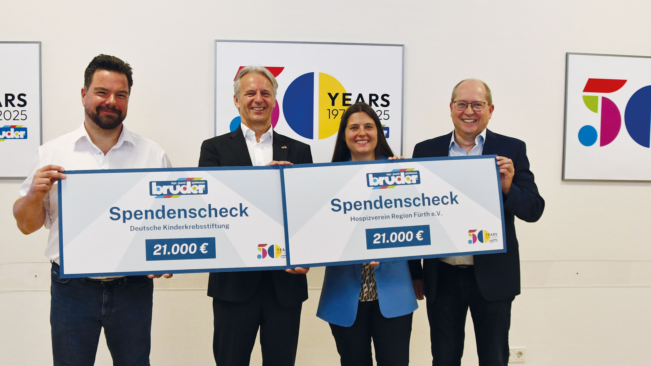 Zum diesjährigen Jubiläum zeigte sich Bruder auch gesellschaftlich engagiert und bat bewusst um Spenden statt Geschenke, verbunden mit dem Versprechen, den eingegangenen Betrag zu verdoppeln. So konnten 42.000 Euro an die Deutsche Kinderkrebsstiftung und den Hospizverein Region Fürth übergeben werden. Beide Organisationen leisten wichtige Arbeit in besonders sensiblen Lebensphasen. Für Geschäftsführer Paul Heinz Bruder eine Herzensangelegenheit.