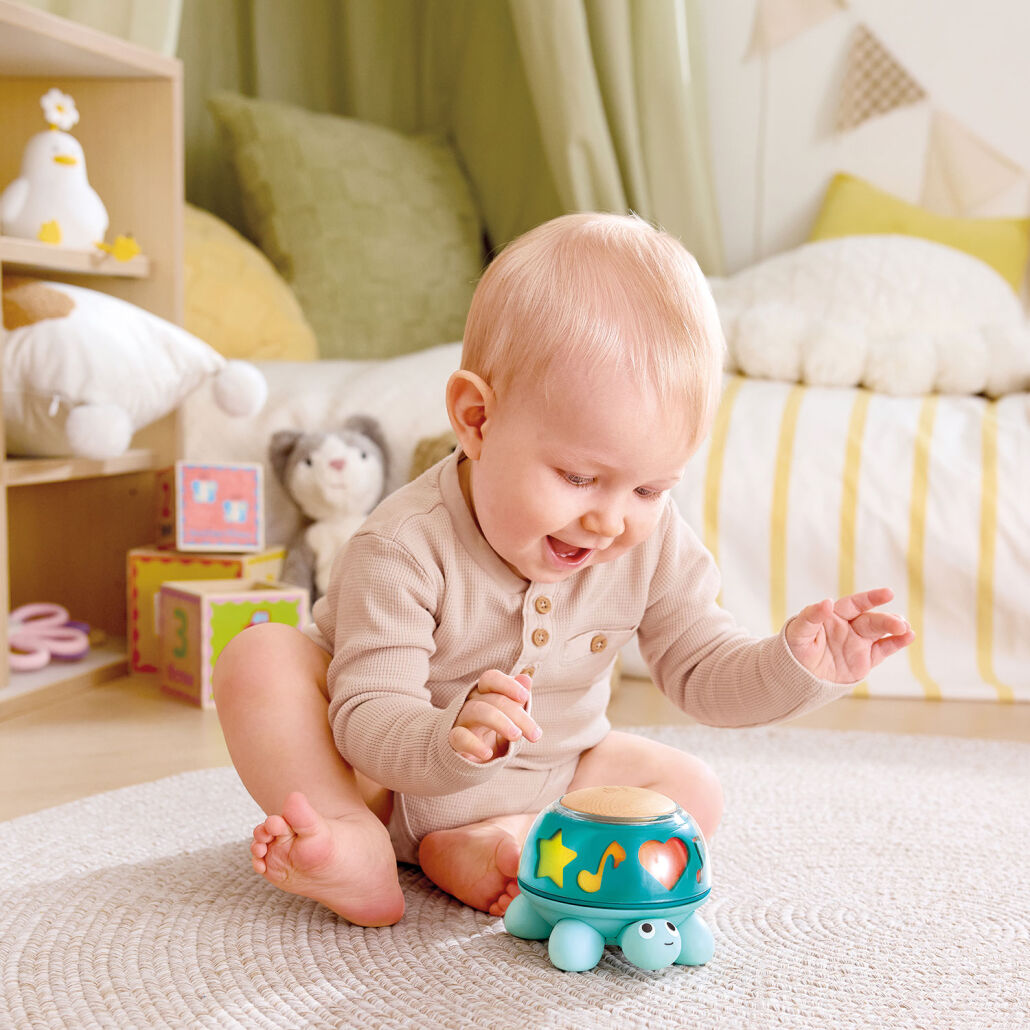 Die musikalische Schildkröte fördert spielerisch Rhythmus sowie Gehör und kann ab Geburt bespielt werden. Sobald ihr Panzer gedreht wird, spielt sie sanfte Töne ab. Dabei kann sie stehen oder auf dem Rücken liegen. Die Gliedmaßen der Schildkröte sind aus weichem, strapazierfähigem Silikon und die Sohlen weisen strukturierte Muster auf, die den Tastsinn anregen. Der Schildkrötenpanzer ist mit bunten Musiknoten gestaltet, die das Farbsehen anregen und zu spielerischem Entdecken einladen.