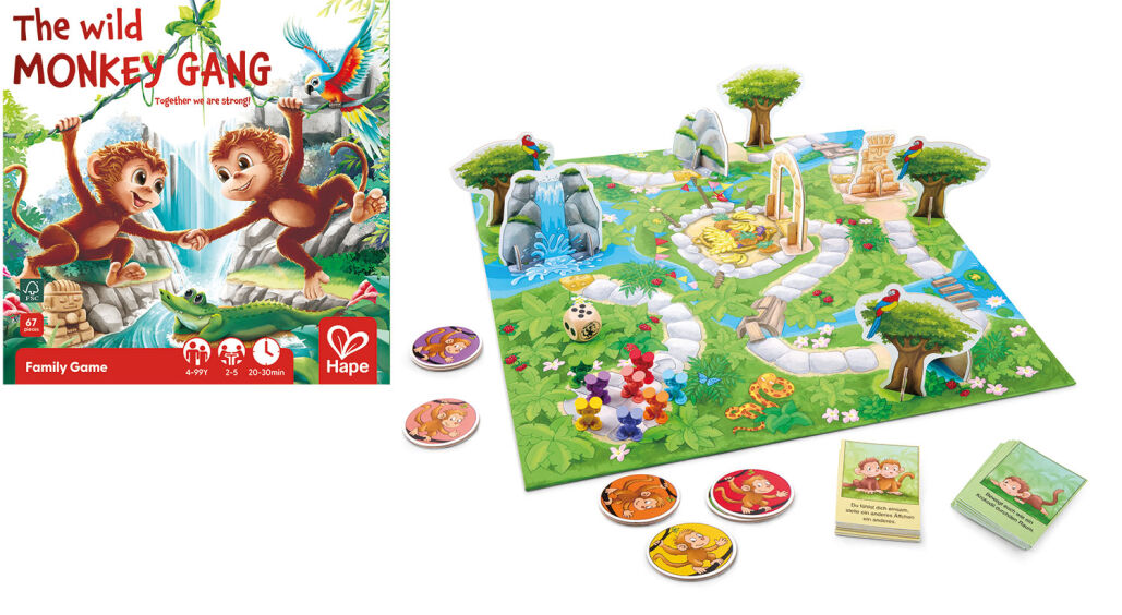 Eine fröhliche Horde Äffchen macht sich auf den Weg ins Tal der Früchte, um dort den begehrten Obstkorb zu ergattern. Doch der Weg ist voller Abenteuer: Ein tosender Wasserfall, ein mächtiger Elefant und weitere Hindernisse können nur gemeinsam überwunden werden. Zu Beginn treten die Spieler als Team an und helfen der Affenbande, den Weg zu meistern, doch im Tal entscheidet sich, welches Äffchen den Obstkorb als Erstes erreicht. So wird aus einem Kooperationsspiel ein spannender Wettlauf um den Sieg. Für zwei bis fünf Spieler ab fünf Jahren.