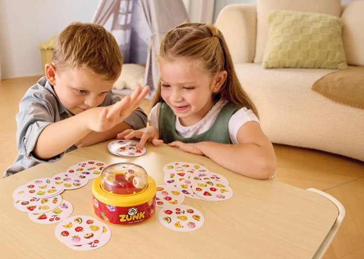 Zunk ist ein dynamisches Mustererkennungs-Spiel, das Geschwindigkeit, Aufmerksamkeit und Spaß vereint. Durch das Antippen von Zunk wird ein rotierender Würfel aktiviert und dann heißt es: genau hinschauen und als Erster passende Muster zwischen Würfel und Karten entdecken. Dank der austauschbaren Würfel wächst Zunk mit – von ersten Spielerfahrungen ab drei Jahren bis hin zu anspruchsvollem Spielspaß für Erwachsene. Zunk bietet ein innovatives Spielkonzept mit besonderem Twist.
