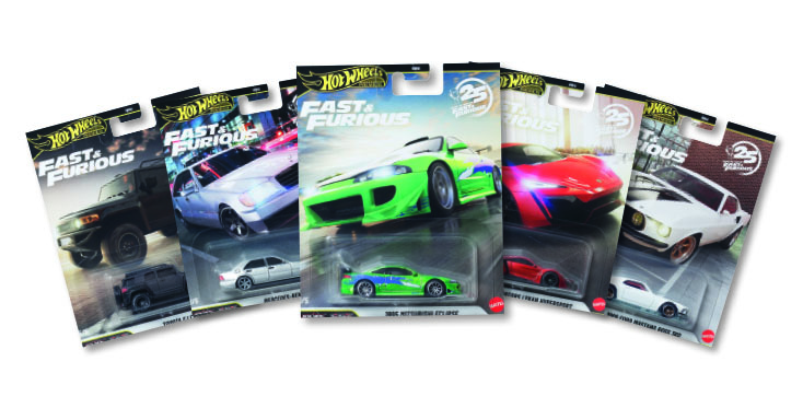 Fast & Furious ist weiterhin eines der erfogreichsten Entertainment-Franchises im globalen Collectibles-Markt. Mattel greift diese Dynamik auf und baut die Hot Wheels Fast & Furious Premium Line weiter aus. Anlässlich des 25-jährigen Jubiläums der Filmreihe im Jahr 2025 rückt das Unternehmen eine kuratierte Auswahl der bekanntesten Fahrzeuge und ikonischsten Filmszenen in den Fokus, umgesetzt in besonders detailreichen 1:64-Die-Cast-Modellen. Ein zentrales Highlight des Jubiläumsprogramms ist die Einführung eines Spectraflame-Fahrzeugs in jeder Wave – eine Premiere für diese Linie. Die Special Editions nehmen Bezug auf zwei prägende Rennsequenzen zwischen Brian und Dom aus dem Originalfilm von 2001 und unterstreichen den Anspruch von Hot Wheels an Authentizität und Sammlerrelevanz.