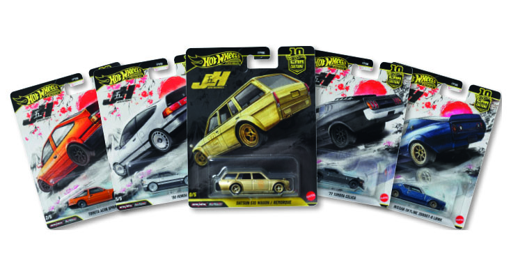 Car Culture ist das Premium-Flaggschiff im Hot-Wheels-Portfolio und zelebriert zeitgenössische Automobilkultur mit klarem Fokus auf Fahrzeugenthusiasten. Als führende Premiumlinie der Marke präsentiert Car Culture erstklassige 1:64-Modelle angesagter Fahrzeuge, wobei jede Launch-Welle von einem starken thematischen Konzept getragen wird. Ein seltenes Chase Car, das die Nachfrage auf dem Sekundärmarkt kontinuierlich ankurbelt, ist fester Bestandteil jeder Zusammenstellung. 2026 feiert das Sortiment sein zehnjähriges Jubiläum – ein Meilenstein, den Hot Wheels mit einer markanten Neuausrichtung begeht. Zum Jubiläumsjahr kehren die begehrtesten Castings der vergangenen Dekade als limitierte Chase-Modelle zurück. Anstelle der bislang bekannten „blacked-out“-Varianten erscheinen die Chase Cars 2026 erstmals in einem auffälligen Gold-Finish, ergänzt um ein spezielles Jubiläumsemblem sowie eine passend gestaltete goldfarbene Verpackung. Damit wird die Premiumpositionierung der Linie nochmals deutlich unterstrichen. Die erste Wave des Jahres 2026 gibt die Richtung vor und markiert eine Rückkehr zu „Japan Historics“, einem der konstant erfolgreichsten Themen der gesamten Reihe. Zum Line-up zählen der 1977 Toyota Celica (RA28), der Toyota AE86 Sprinter Trueno, der im Liberty-Walk-Stil gestaltete Nissan Skyline 2000GT-R, der ’88 Honda CRX sowie der Datsun 620 als exklusives goldfarbenes Chase Car – eine Auswahl, die gezielt an die anhaltende Faszination für JDM-Kultur anknüpft.