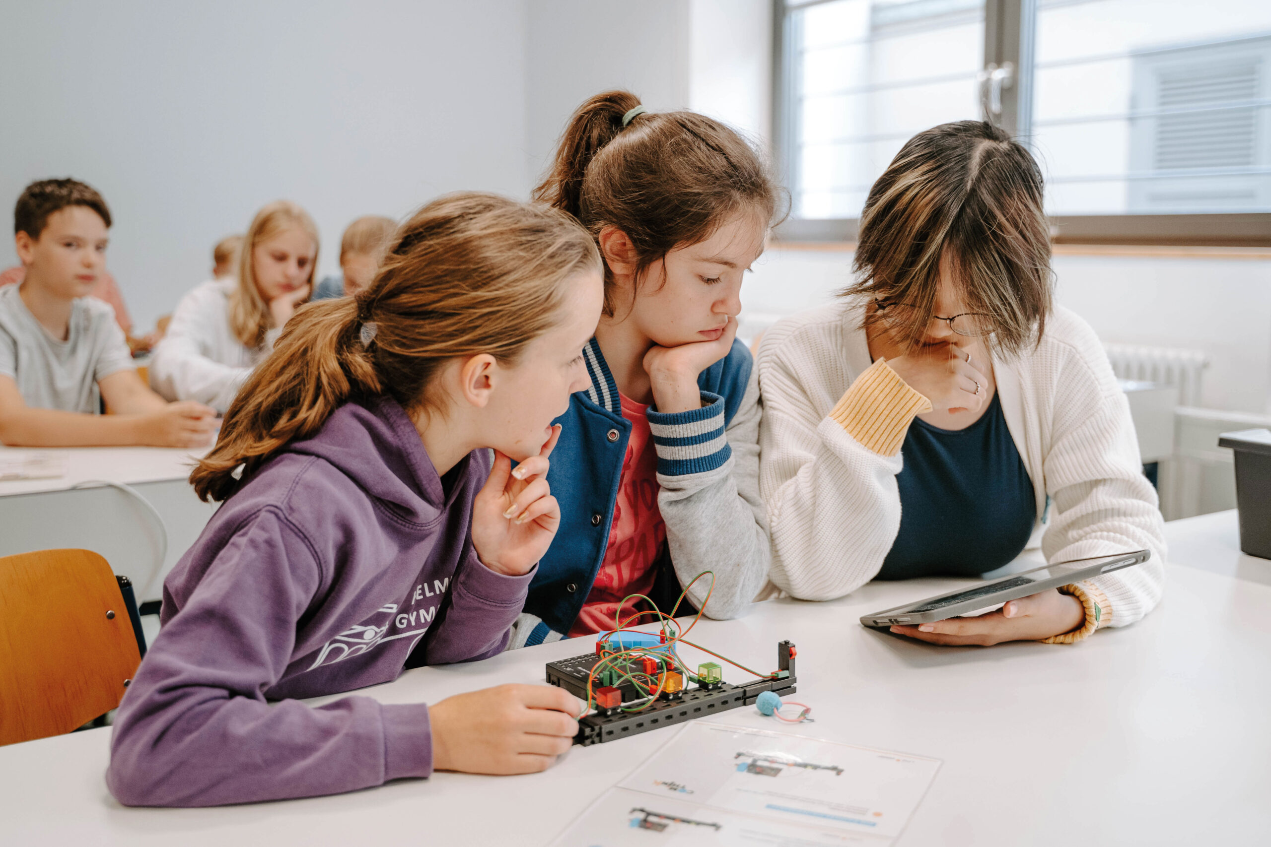 Das Projekt ist Teil des Innovationsprogramms „Digitale Schule“ des Kultusministeriums Baden-Württemberg und verfolgt ein klares Ziel: Schulen sollen befähigt werden, informatische Denkweisen wie Mustererkennung, logisches Analysieren oder systematisches Problemlösen praxisnah zu vermitteln und das mit Werkzeugen, die über reines Programmieren hinausgehen. Am Helmholtz-Gymnasium ist man bereits mitten in der Umsetzung. In der 7. Klasse arbeiten die Schülerinnen und Schüler schon an eigenen kleinen Projekten mit den speziell entwickelten ComThink-Sets von fischertechnik. Diese beinhalten Bauelemente, Sensorik, Steuerungseinheiten und anschauliche Unterrichtsmaterialien.