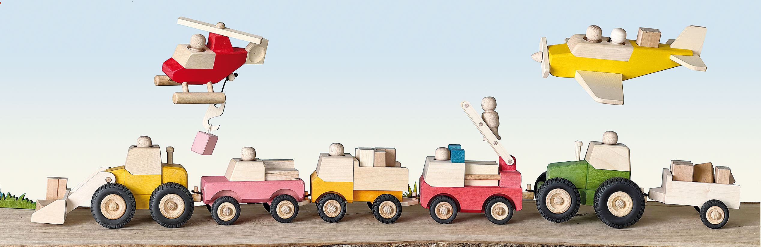 Seit Mitte August ist nun das neue Baby „Holler Poller Holzspielzeug“ auf dem Markt. Und man sieht den Produkten ihren Gestaltungsanspruch an. Sie sind sehr schlicht und prägnant. Und auch hier steckt ein Spielsystem in der DNA. So haben die Fahrzeuge zum Beispiel eine Textilschlaufe, mithilfe derer sie miteinander verkettet werden können. So kann ein langer Zug an Autos, LKW, Traktoren und so weiter gebaut werden.