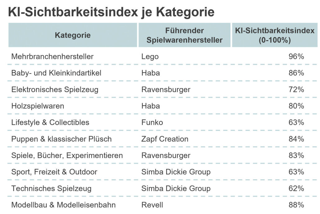 – Der Vorteil der Mehrmarkenhersteller: Große Akteure wie die Simba Dickie Group, Mattel oder Ravensburger profitieren von ihrer Portfolio-Struktur. Die KI zerlegt allgemeine Fragen in spezifische Teilsuchen. Mehrmarkenhersteller agieren „mit mehreren Pfeilen im Köcher“ und besetzen unterschiedliche Nischen gleichzeitig. Dadurch erzielen sie die höchste kumulierte Gesamtsichtbarkeit.