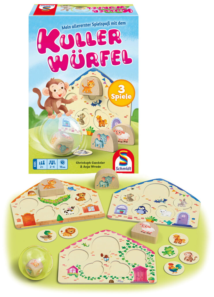 „Sobald der „Kullerwürfel“ im Raum liegt, beginnt spielerisches Entdecken. Die neue Spielesammlung von Schmidt Spiele richtet sich an die Allerkleinsten und bietet in drei abwechslungsreichen Varianten jede Menge Möglichkeiten zum Ausprobieren, Spielen und ersten Lernen. Im Zentrum des Spielerlebens stehen der Kullerwürfel sowie drei Häuser und niedliche Holztiere.“