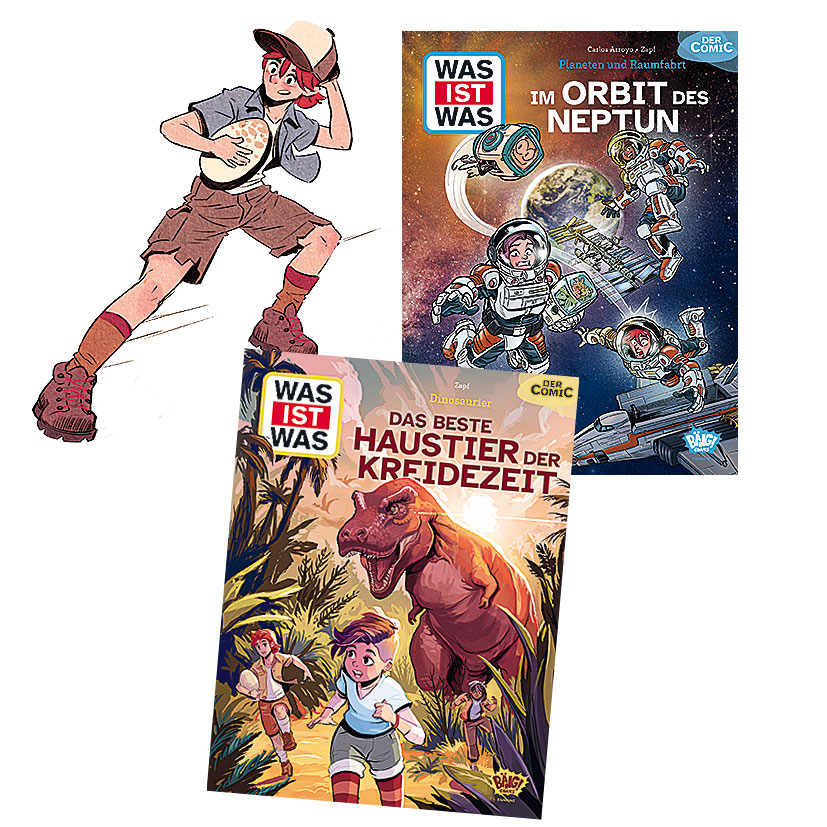 Zwei brandneue Was Ist Was Comics bilden den Auftakt für eine neue Wissenscomic-Reihe, die in Kooperation zwischen dem Tessloff Verlag und Egmont Bäng! Comics entsteht. Ab dem 8. Oktober können sich Fans der Kinder- und Jugendsachbuchreihe über Nachschub im Bücherregal freuen. In jedem Band erleben die drei Hauptfiguren Will, Iris und Wenko spannende Abenteuer. In den ersten beiden Bände dreht sich alles um die Themen „Dinosaurier“ sowie „Planeten und Raumfahrt“.