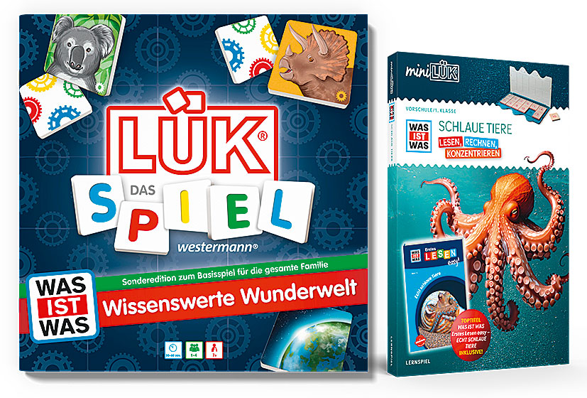Lük ist eine spielerische Lernhilfe, bei der Lernende ihre Antworten selbst überprüfen können. Mit dem Lük-Spiel „Was Ist Was Wissenswerte Wunderwelt“ und dem miniLük-Heft und -Set „Schlaue Tiere“ macht Lernen jetzt noch mehr Spaß. Typisch für Lük werden bei dem Spiel Zahlenplättchen zu den einzelnen Fragen und Aufgaben auf die richtigen Antworten platziert, sodass auf der Rückseite das richtige Muster entsteht.