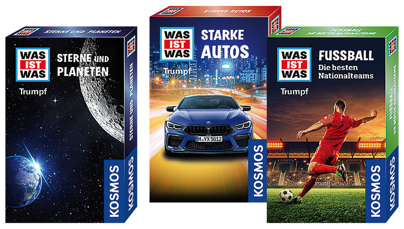 In den beliebten Kartenspielen von Kosmos versuchen sich die Spielerinnen und Spieler unter anderem zu den Themen Fußball, Autos oder Sterne und Planeten gegenseitig zu überbieten. Das bekannte Kartenspielprinzip vermittelt so spielerisch Wissen und sorgt für jede Menge Actionspaß. Im Rahmen eines Relaunches erscheinen die Spiele alle in neuem Look, und die Verpackungen kommen ganz ohne Plastik aus.