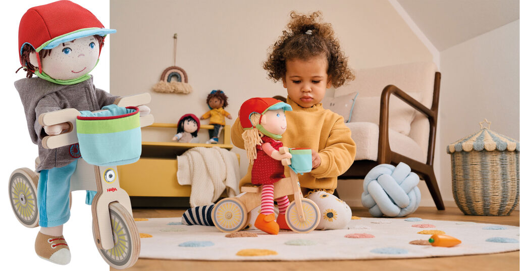 Mal Sonnenschein im Garten, mal Kuschelwetter drinnen – mit den neuen Laufrad-Sets Annelie und Lian bleibt der Spielspaß immer in Bewegung. Die liebevoll gestalteten Stoffpuppen sausen auf ihren stabilen Holzlaufrädern los, natürlich mit Helm und Korb für all die kleinen Schätze am Wegesrand.
