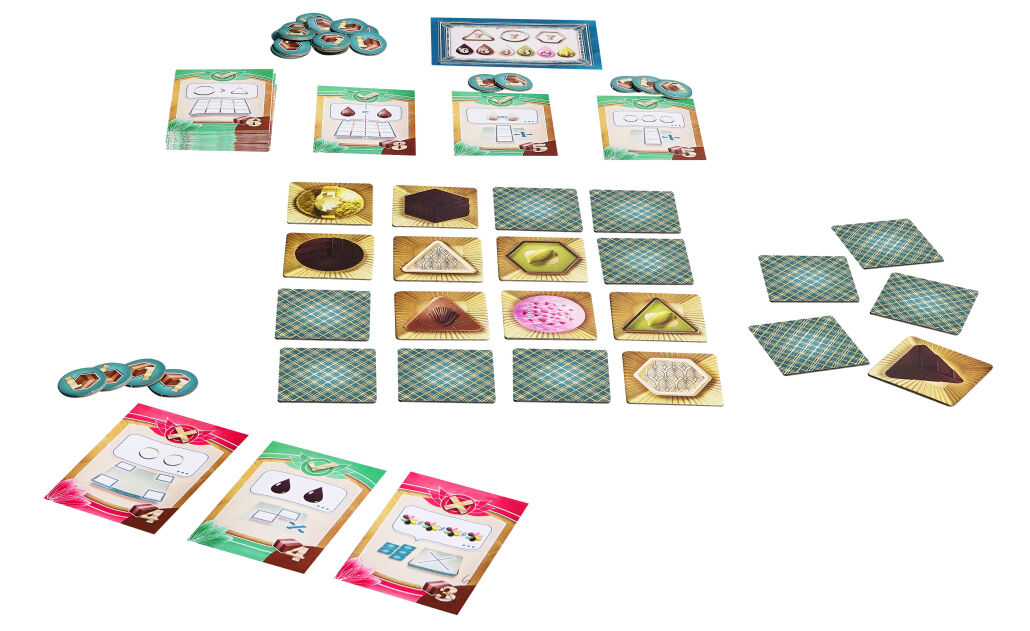 Auf großen quadratischen Karten sind die Süßwaren abgebildet und bilden verdeckt ein 4×4-Raster. Das ist die Pralinenschachtel. Weitere fünf Kärtchen liegen ebenfalls verdeckt daneben. Die Spieler nehmen eine Tipp-Karte aus einem offenen Angebot, was zu Beginn noch keiner tut. Auf jeden Fall muss schließlich immer eine Pralinenkarte aufgedreht werden. Dadurch wird zunehmend offenbar, was da wo in der Schachtel liegt. Je mehr offen ist, um so eher wird bei den Tipp-Karten zugegriffen. Es geht um Nachbarschaften und Reihenbildungen in bestimmten Schoko-Farben oder auch Pralinen-Zuschnitten. Das weiß aber keiner ganz genau, weshalb spekuliert werden muss. Auch darf beim Nehmen einer Tipp-Karte auf das Gegenteil gesetzt werden. Liegen da zwei Schokis mit rosa Zuckerguss nebeneinander, dann wird mit der grünen Tipp-Seite spekuliert. Glaubt der Spieler an das Gegenteil? Dann wird die Karte auf Rot gewendet. Auf jeden Fall zählen bei der Endwertung nur richtige Einschätzungen Pluspunkte.