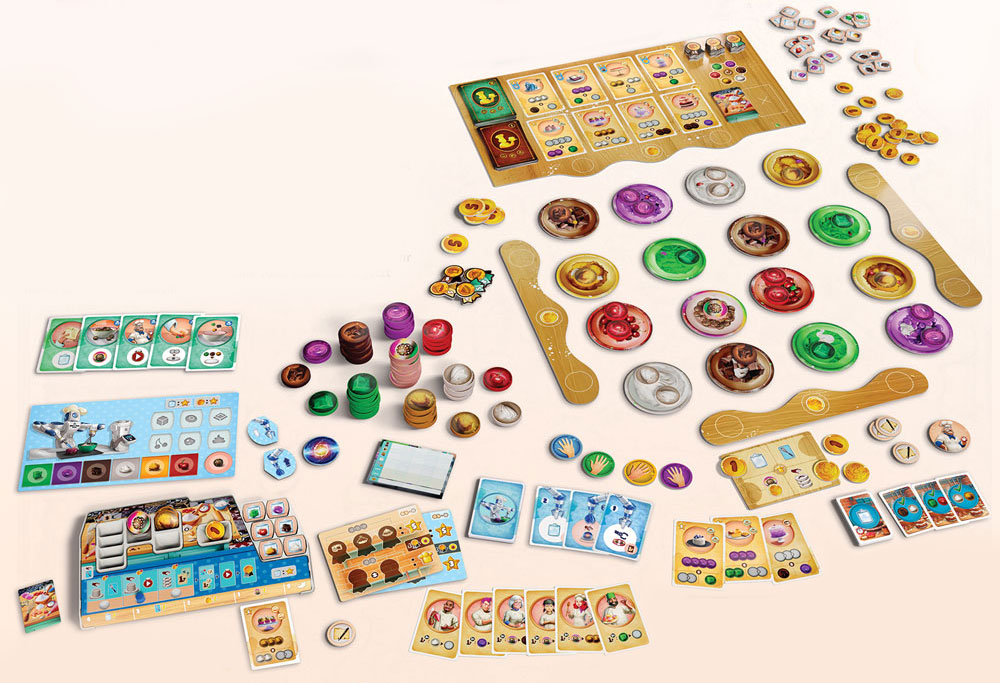 Tatsächlich, in der Tischmitte liegen verschiedene Schalen mit Streusel, Wackelpudding, Kandis und manchem mehr. Dort befinden sich auch Rezeptkarten, einige einfacher, andere anspruchsvoller zu erfüllen. Bei der Zubereitung geht es stets um den passenden Mix der Ingredienzien. Außerdem befinden sich dort Küchenmaschinen(karten), die sehr nützlich sein können. Der eigene Ablagebereich, die Tischzeile in der Backküche, die jeder für sich bespielt, beinhaltet Aufbewahrungsecken für die Zutaten. Diese unterliegen Einschränkungen. Das Ablegen und Horten nützlicher Beigaben ist niemals beliebig. Dann gibt es eine Legezeile für die Rezepte. Wer am Zug ist, hat die Wahl zwischen drei Aktionsalternativen, um Backmischungen und Rezepte vorzubereiten. Mit Goldtalern, die sehr nützlich sind, lässt sich eine weitere Aktion dazu kaufen. Geld sollte nie ausgehen. Schließlich schaut jeder am Ende seines Zuges, ob für bestimmte Backkunst Medaillen vergeben werden. Je schneller ein Ziel erreicht wurde, desto höher ist der Medaillenlohn.
