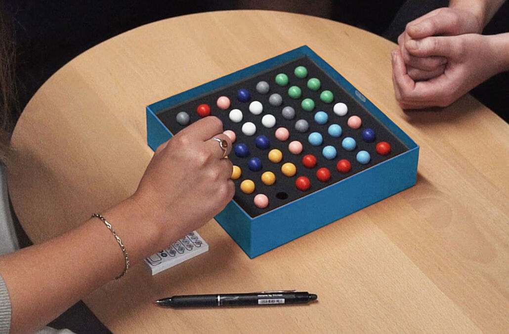 Die Auslage ist schnell geschaffen. Alle helfen gemeinsam und achten, dass es keine zwei farbgleichen Kugeln in Nachbarschaft gibt. Dann muss alles zu acht farbigen Gruppen mit jeweils sechs Murmeln arrangiert werden. Der Spieler am Zug versetzt immer eine beliebige Kugel in das einzige freie Loch des Auslagenrasters. Ein Spieler notiert fortlaufend die Anzahl der Züge. Das ist wichtig, für eine anschließende Bewertung.