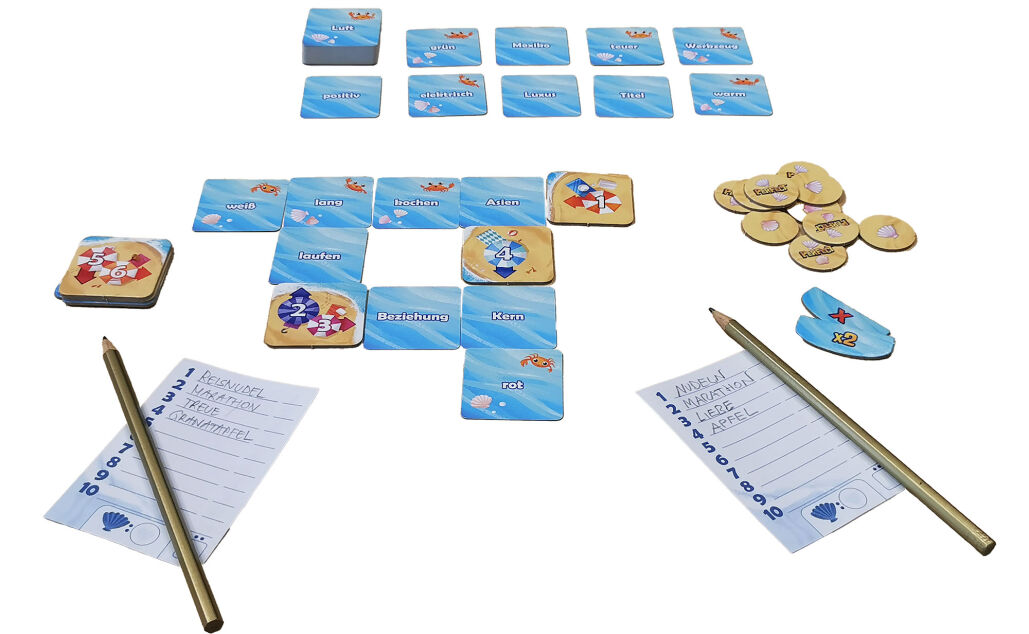 Gemeinsam wird mit quadratischen Kärtchen ein Gitterraster wie beim Kreuzworträtsel erstellt. Auf den Plättchen stehen einfache Begriffe wie „Asien“, „Werkzeug“ oder „spitz“. So werden kreuz und quer Wort-Reihen gebildet. Sobald insgesamt zehn solcher Ketten ausliegen, muss jeder zu den Vorgaben Assoziationen notieren. Passt zu „Asien“, „Werkzeug“ und „spitz“ vielleicht „Essstäbchen“?