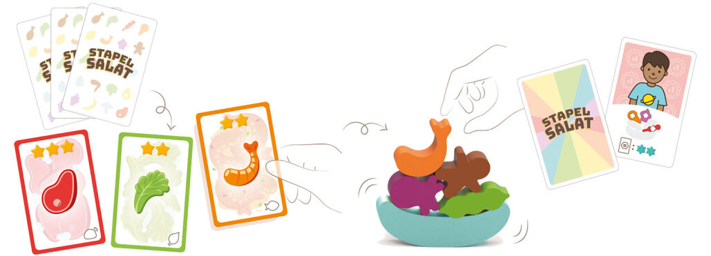 Jeder bekommt einen schmalen Teller, der schon etwas kippelig auf dem Tisch steht. Insgesamt stehen 21 verschiedene Häppchen zur Verfügung, von denen stets nur ein paar wenige im Angebot sind. Der Reihe nach nimmt sich jeder ein Teil und legt es zunächst auf seinen Teller. Schon bald muss gestapelt werden. Da die Lebensmittel bisweilen recht unförmig sind, lässt sich beispielsweise ein Tintenfisch mit seinen Tentakeln keinesfalls wackelfest auf dem Teller platzieren. Dann wird es zunehmend instabil. Nach wenigen Runden ist Schluss. Wer die wertvollen, weil unförmigen Zutaten geschickt in seiner Lebensmittelpyramide eingebaut hat, bekommt ordentlich Punkte. Wer den höchsten „Fressturm“ geschichtet hat, erhält Extrazähler.