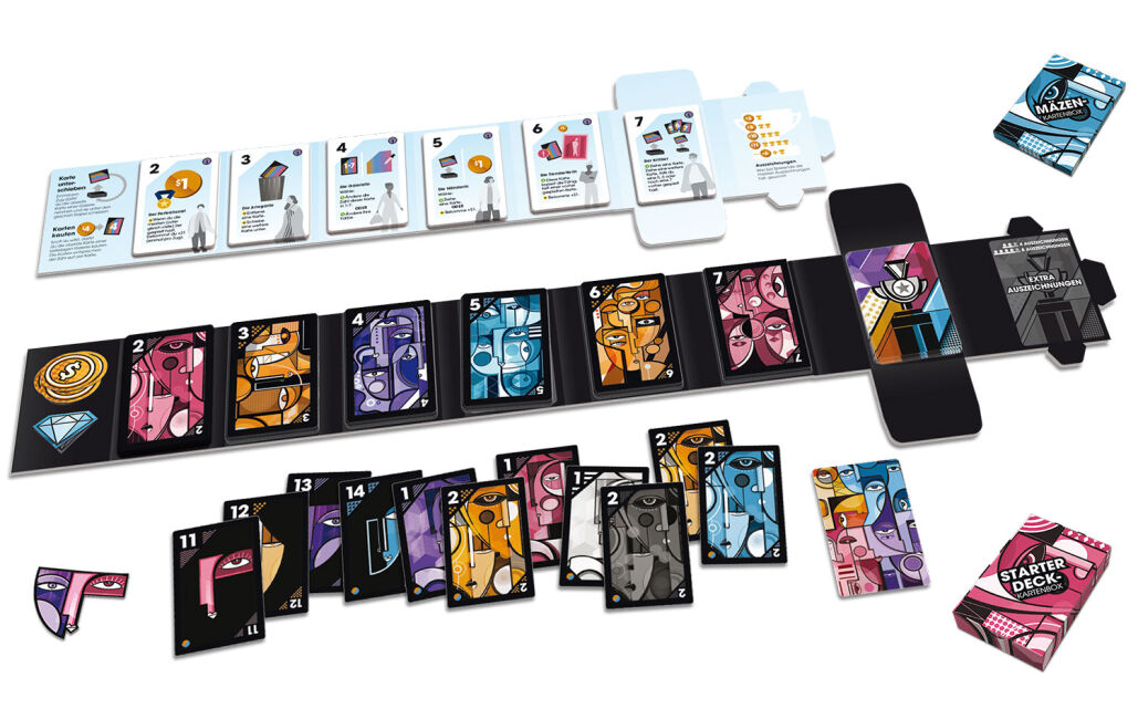 Das A und O des Spiels sind die kleinen Feinheiten, die jeder erkennen und für sich nutzen muss. Mal darf beim Markt eine Karte unter den Stapel geschoben werden, in der Hoffnung, dass eine farbgleiche zum eigenen Blatt oben erscheint. Mal sind es die Förderer-Karten, die im richtigen Zeitpunkt ordentlich Vorteil bringen. Die Mäzene korrespondieren mit den Kartenwerten der Galerie-Bilder. Da sollte jeder seine Möglichkeiten einer aktuellen Ausstellung kennen und klug nutzen. Das alles muss optimal gespielt werden. Für Abwechslung sorgen verschiedene Wohltäter, die in Folgepartien verwandt werden können und das Spiel anspruchsvoller gestalten. Unglücklicherweise ist die Spielregel nicht gut verfasst und bei einem Kartentext (Die Arrogante im zweiten Teil) gänzlich unverständlich. Das ist handwerklich ein grober Schnitzer. Als einfaches Deck-Building-Spiel mit schönem, passenden Thema ist das Spiel aber dann doch etwas Besonderes.