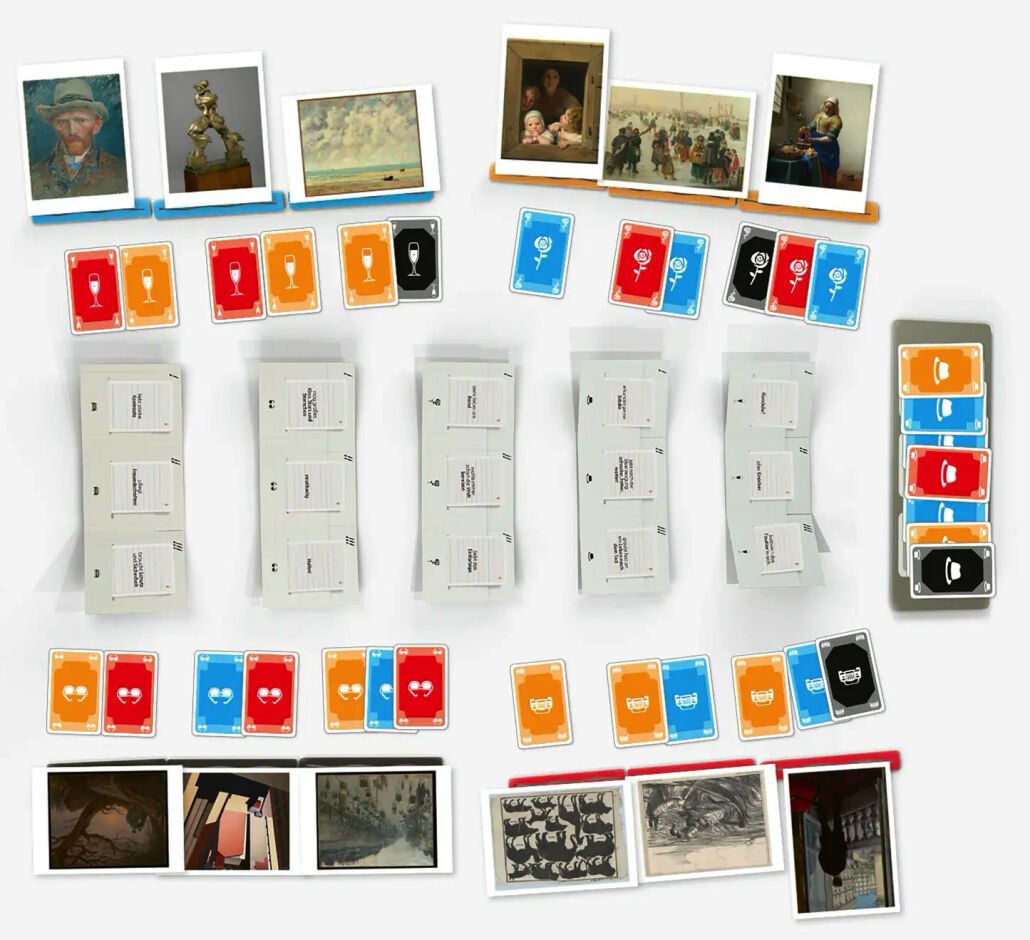 100 Abbildungen in Postkartengröße sind das Herzstück des Spiels. Jeder bekommt sieben zugeteilt. Dann gibt es noch Eigenschaftskärtchen, von denen jeder eines erhält. Dieses ist beidseitig bedruckt. Gleichzeitig spielen alle. Sie entscheiden sich für eine der Eigenarten auf ihrer Karte und ordnen dieser eines der eigenen Kunstwerke zu. Das passiert im Geheimen. Alles wird in einem Pool veröffentlicht. Eine zufällig gezogene Fake-Karte eines Hochstaplers, der nicht am Spiel teilnimmt, kommt noch dazu. Sie sorgt etwas für Verwirrung. Mittels Symbolkarten wird von jedem zugeordnet, welches Kunstwerk wohl zu welcher Eigenschaft passt. Übereinstimmungen werden mit Punkten belohnt.