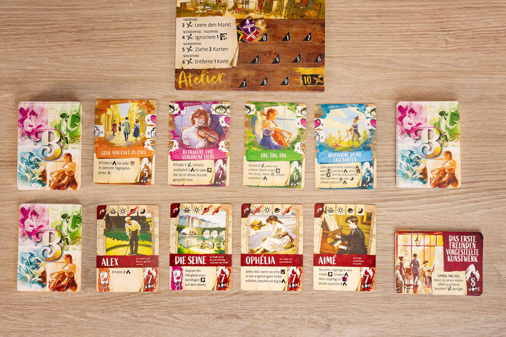 Mit einem schmalen Startdeck beginnt jeder. Aus fünf Handkarten müssen vier in eine Reihe gepuzzelt werden, um so den Tag zu planen. Neben aussagekräftigen Texten sind Icons auf den Karten wichtig, die gut zusammengefügt werden müssen, um Inspirationspunkte zu erhalten. Mit diesen lassen sich weitere Karten, die bisweilen besser in die Tagesplanung passen, erwerben. Auch können Musen gewonnen oder gar die spielentscheidenden Erfolgskärtchen gekauft werden. Durch neue Karten wird das eigene Deck verbessert und die Inspirationsausbeute wächst sukzessive. Dummerweise ist das süße In-den-Tag-Hineinleben nicht ohne Folgen. Den Erhalt schwarzer Leidenskarten muss jeder akzeptieren, es sei denn, es werden im Tagesverlauf ein paar Stündchen für den Job als Straßenmusiker oder Barfrau eingeschoben. Dann hat man etwas Geld für das Lebensnotwendige, aber es bleibt weniger Zeit, Inspirationen zu sammeln. Ein Dilemma.
