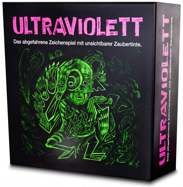 Abgefahrenes Zeichenspiel. Es ist nicht neu, dass ein zusammengewürfelter Satz aus Subjekt, Prädikat, Adjektiv und Objekt gezeichnet werden muss. Z. B.: Pinocchio verbuddelt einen feuchten Flamingo. Gänzlich neu ist nun, dass mit UV-Stiften gemalt werden muss, so dass der Spieler mehr nach Gefühl als nach Augenschein zeichnet. Mit einer UV-Licht-Lampe wird das Gemälde beleuchtet und die anderen raten, was da zu Papier gebracht wurde. Dabei hilft, dass es pro Kategorie sechs Vorgaben gibt. Wie eingangs gesagt: Abgefahren!