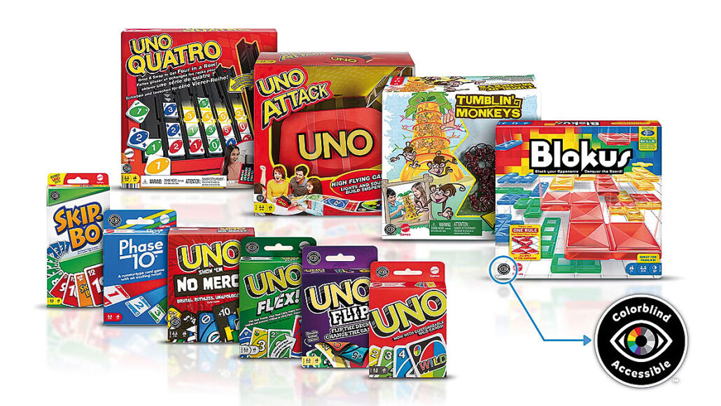 … das ist das erklärte Ziel für das Mattel-Spieleportfolio bis Ende des Jahres. Ein ehrgeiziger Ansatz – und zum Teil sind die Lösungen so simpel wie naheliegend: Uno-Farbkarten kriegen Symbole und Blokus- Steinchen Strukturen. Der US-Hersteller zeigt so nicht zum ersten Mal, dass Zugangsbarrieren abbaubar sind und Minderheiten ebenfalls ernst genommen werden in ihren Spielbedürfnissen.