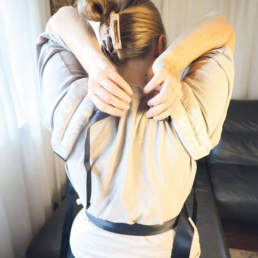 Mir ist es immer wichtig, den Eltern zunächst die Sorge zu nehmen. Viele denken: „Alle anderen schaffen das doch, warum fällt es mir so schwer?“ Ich sage dann immer, jeder hat irgendwann das erste Mal getragen. Manche finden schneller hinein, andere sind vielleicht etwas verkopfter und brauchen mehr Zeit und Zuspruch und das ist völlig in Ordnung. Ich empfehle zum Beispiel, die Tragehilfe zunächst im Sitzen anzulegen. Das nimmt vielen schon die Unsicherheit. Auch das Üben mit einem Kissen oder gemeinsam zu zweit kann helfen. Grundsätzlich gilt sich bewusst Zeit zum Üben zu nehmen. Diese Routine entwickelt sich schnell, oft merkt man schon nach wenigen Versuchen, wie viel sicherer man sich fühlt.