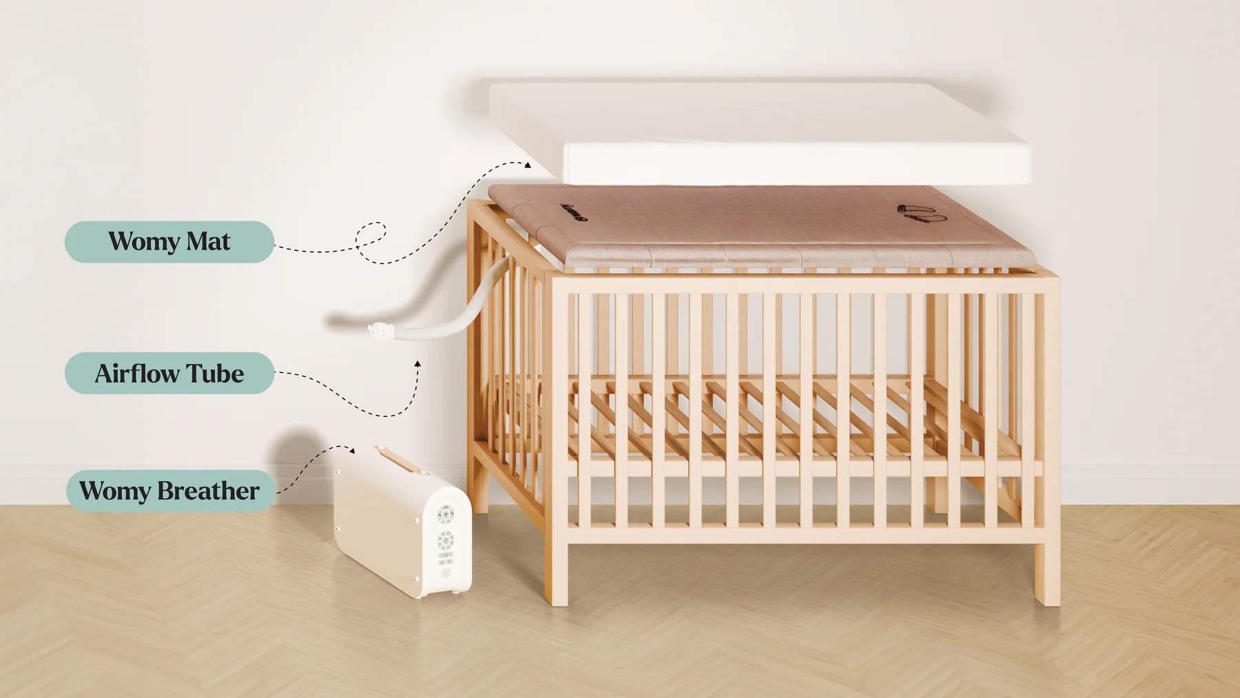 Der Womy Sleeper passt in jedes Standard-Kinderbett (60 × 120 Zentimeter oder 70 × 140 Zentimeter). Im Bettchen befindet sich kein Strom, und der Womy Sleeper schaltet sich automatisch ab. Wenn das Baby zu weinen beginnt, registriert der Weinsensor dies und aktiviert das System bei Bedarf erneut. Und wer sich wegen möglicher Abhängigkeit? Kein Problem — Du kannst die beruhigenden Klänge, die Wiegegeschwindigkeit und die Dauer schrittweise reduzieren, sobald Dein Baby auch alleine gut schläft.