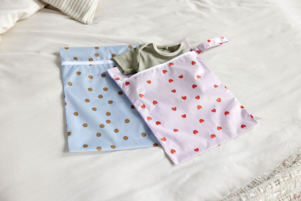 In den Wet Bags von Lässig sind Windeln, nasse Schwimmsachen oder Pflegeprodukte unterwegs sicher verstaut. Das Set besteht aus zwei leicht zu reinigenden Nasstaschen aus 100 Prozent Polyester mit einer Beschichtung aus 100 Prozent Polyurethan. Erhältlich in den beiden Designs „Heart Lavender“ und „Smile Sky Blue“.