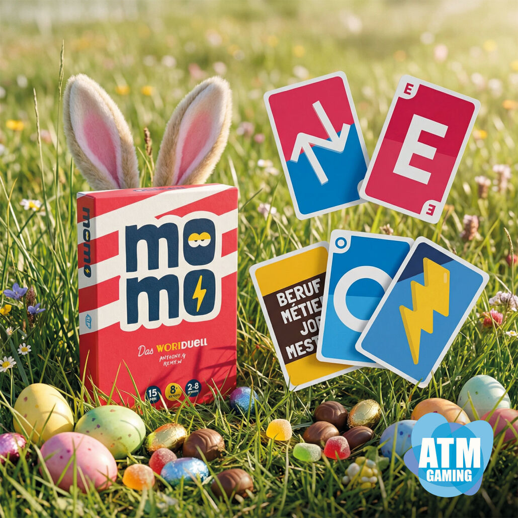 Zusammen mit dem Autor von „QuickStop“ veröffentlicht ATM Gaming pünktlich zu Ostern „MoMo – Das Wort-Duell“, ein Spiel, bei dem zwar nicht nach Eiern, aber nach den richtigen Wörtern gesucht wird. Das Spielprinzip ist so simpel wie unterhaltsam: Alle Spieler decken gleichzeitig Karten mit Vorgaben auf. Diese zeigen blaue Pflicht- und rote Verbotsbuchstaben; Sonderkarten können zusätzlich das Themengebiet oder die Anzahl der Silben festlegen. Anschließend gehen alle gleichzeitig auf die Suche nach einem Wort, das alle Vorgaben erfüllt. Fehlen einem Spieler die Worte, sammelt er Strafpunkte.