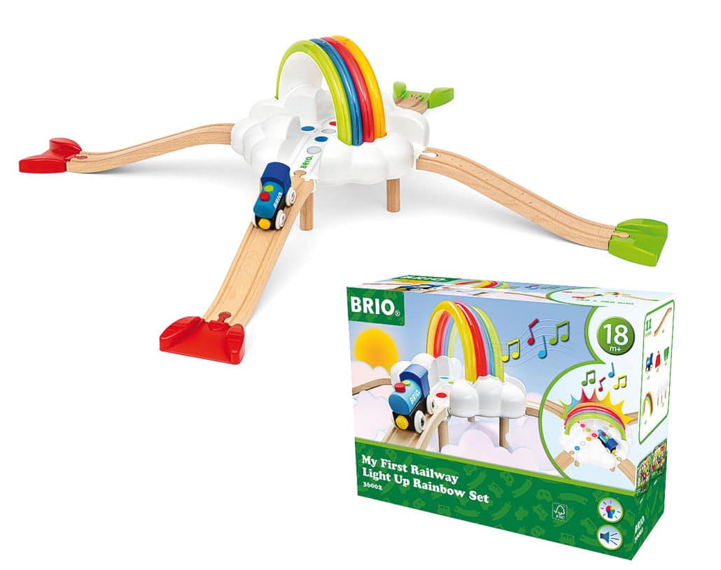 Mit dem Regenbogen Eisenbahn-Set von Brio haben Kinder sicher Spaß am Lernen: Das Farbspiel des Regenbogens gibt einfache Aufgaben vor. Können die kleinen Eisenbahner die Herausforderungen mithilfe der Lok erfüllen, leuchtet zur Belohnung der Bogen über den Wolken in allen Farben und eine Melodie ertönt. Spielerisch erforschen sie so das Prinzip von Ursache und Wirkung. Die interaktive Eisenbahn ist kompatibel mit allen Produkten der Brio World.