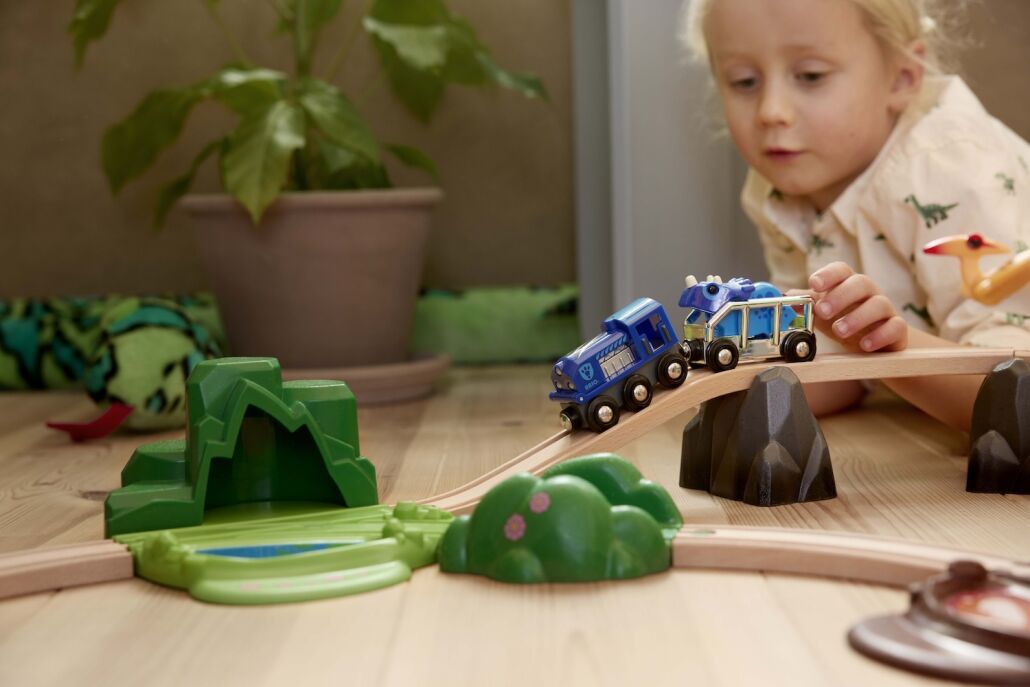 Der limitierte Sondereditions-Dinosaurier-Zug macht was her auf den Schienen. Mit seiner silber-blauen Lackierung und einer exklusiven, blauen Triceratops-Figur begeistert er Kinder und Sammelfans gleichermaßen. Unter der Lokhaube verbirgt sich ein glänzender Motor, der auf das nächste Abenteuer wartet. Sobald der Dinosaurier sicher im Waggon verstaut ist, kann die Reise losgehen. Der exklusive Zug ist nur in diesem Jahr erhältlich und eine besondere Ergänzung für jede Brio World.