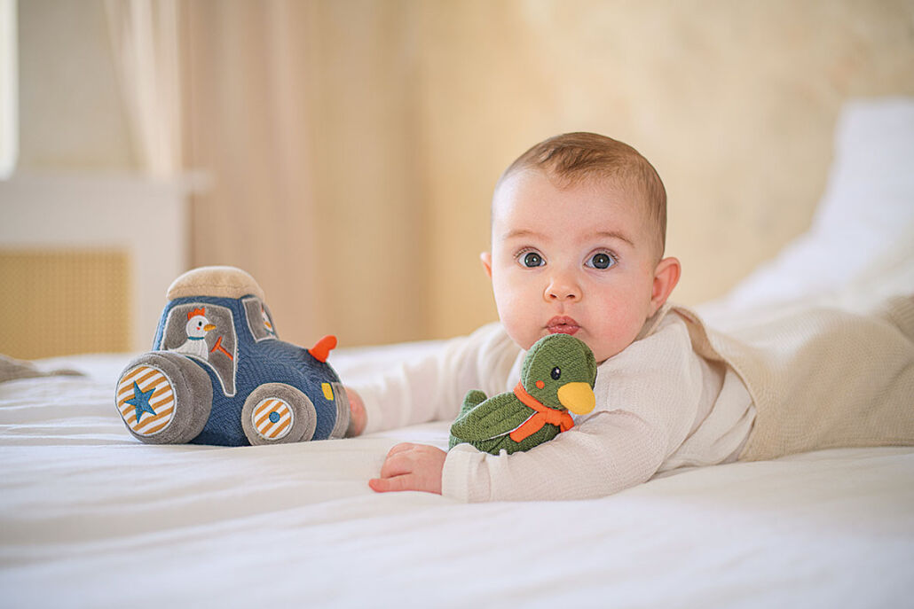 Das Activity-Spielzeug im fröhlichen Traktor-Design von Die Spiegelburg macht Babys neugierig. Es knistert und rappelt sanft beim Spielen, ein kleines integriertes Glöckchen lässt die Kleinen aufhorchen.