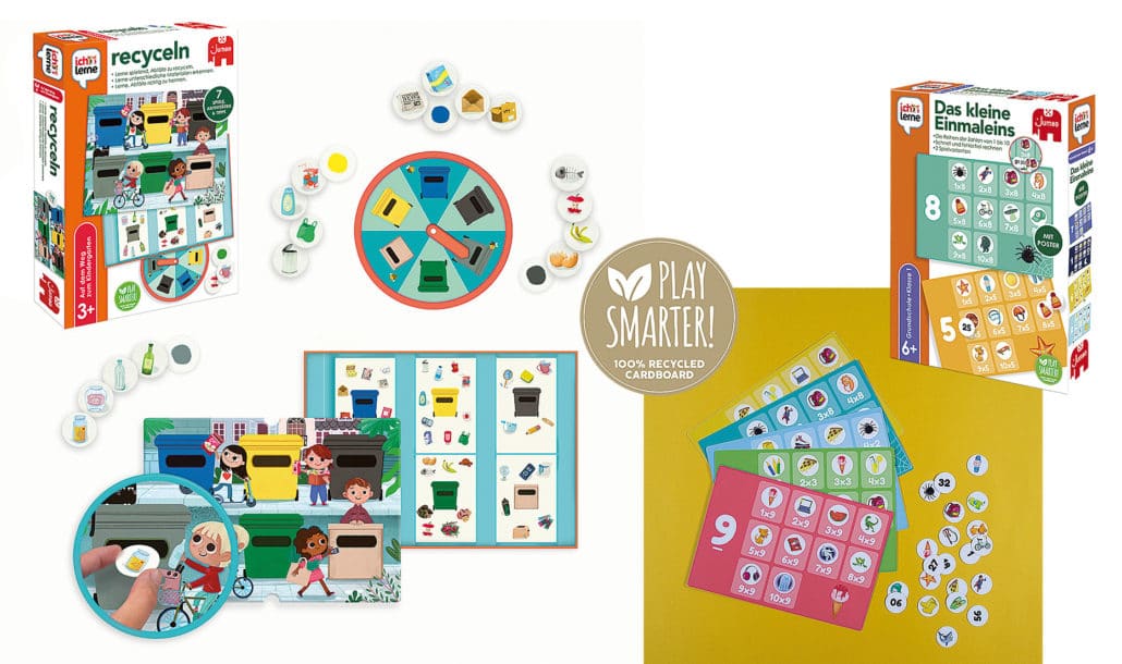 Heutzutage können Eltern ihre Kinder gar nicht früh genug mit dem Thema Umweltschutz in Berührung bringen. Mit dieser Überzeugung präsentiert der Jumbo-Verlag im Rahmen seiner „ich lerne“-Serie eine besonders wichtige Spieleneuheit: „ich lerne recyceln“ wurde speziell für Kinder ab drei Jahren entwickelt. Für angehende Rechenkünstler gibt es „ich lerne das kleine Einmaleins“. Beide Spiele sind aus recyceltem Karton produziert und tragen das Jumbo Play Smarter-Siegel.