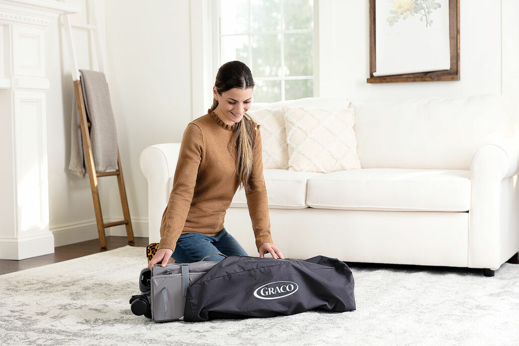 Das Graco FoldLite hat ein Geheimnis: Auf Reisen wird es zum Bett, zuhause zum sicheren Laufstall. Je nach Verwendung lässt es sich auf zwei verschiedene Arten zusammenklappen. Zuhause nutzen Eltern den einfachen und schnellen Home-Fold-Modus. Mit nur einem Handgriff wird das FoldLite flach auf nur 26 Zentimeter Breite zusammengeschoben und verschwindet unauffällig hinter dem Sofa. Mit dem Travel-Fold-Modus sind Familien unterwegs besonders flexibel, denn es macht sich klein und kompakt und passt so in jeden Kofferraum, Camper oder auch auf jede Ablage im Zug oder Flugzeug.