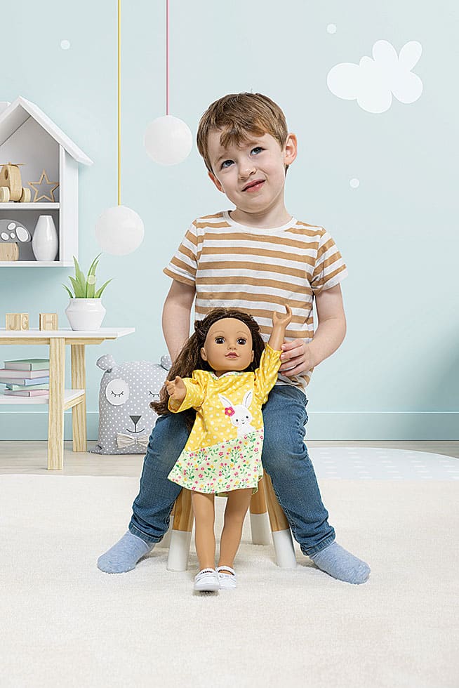 Modisch und in fröhlichen Farben starten Puppen in den Frühling. Zur Kollektion der neuen Bekleidungsserie „Bunny Lou“ gehören niedliche Kleidchen, bequeme Outfits und eine freche Latzhose. Besonders hübsch ist das Tunika-Puppenkleid aus fließendem Stoff in Gelb mit weißen Sprenkeln und asymetrisch abgesetztem Blumenmuster. Am Öhrchen der Hasenapplikation sitzt eine rote Blüte. Das Puppenkleid gibt es für Puppen der Größen 35 bis 45, 28 bis 35 sowie 20 bis 25 Zentimeter.
