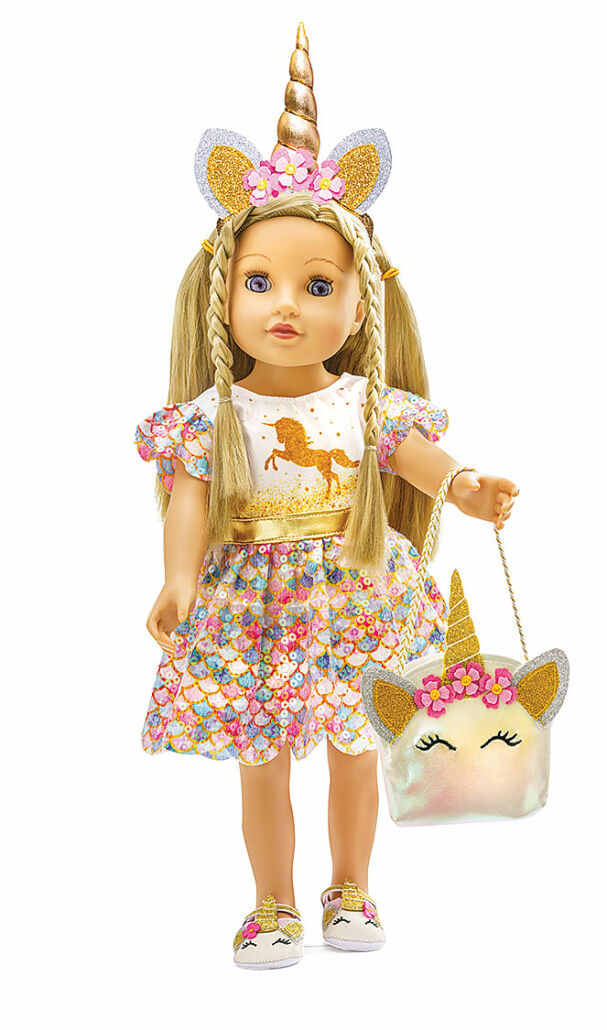 Das Heless Puppen-Glitzerkleid „Einhorn Goldy“ mit bezauberndem Einhorn-Print auf dem Oberteil versetzt Puppeneltern in einen Freudenrausch der Farben. Den blütenförmigen Rock des Kleides zieren leuchtende Meerjungfrau-Schuppen, die mit schimmernden Pailletten besetzt sind. Das goldene filigrane Einhorn bietet dazu einen tollen Kontrast und setzt „Goldy“ edel in Szene.