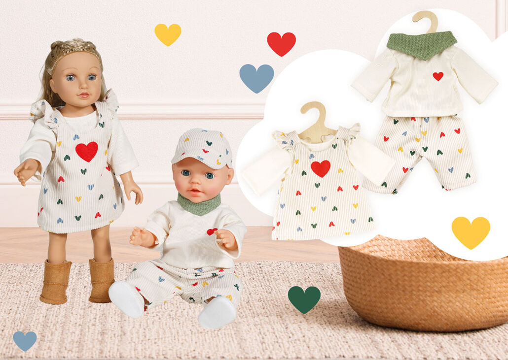 Dass die Designs von Heless von Herzen kommen, zeigt die neue Puppenbekleidungsserie „Herz-Konfetti“ schon auf den allerersten Blick. Bunte Herzchen-Prints auf sanftem, beigem Cord verleihen gute Laune, und mit niedlichen Accessoires, die die Puppen-Outfits ergänzen, wird diese Kollektion schnell die Herzen aller Puppeneltern erobern.