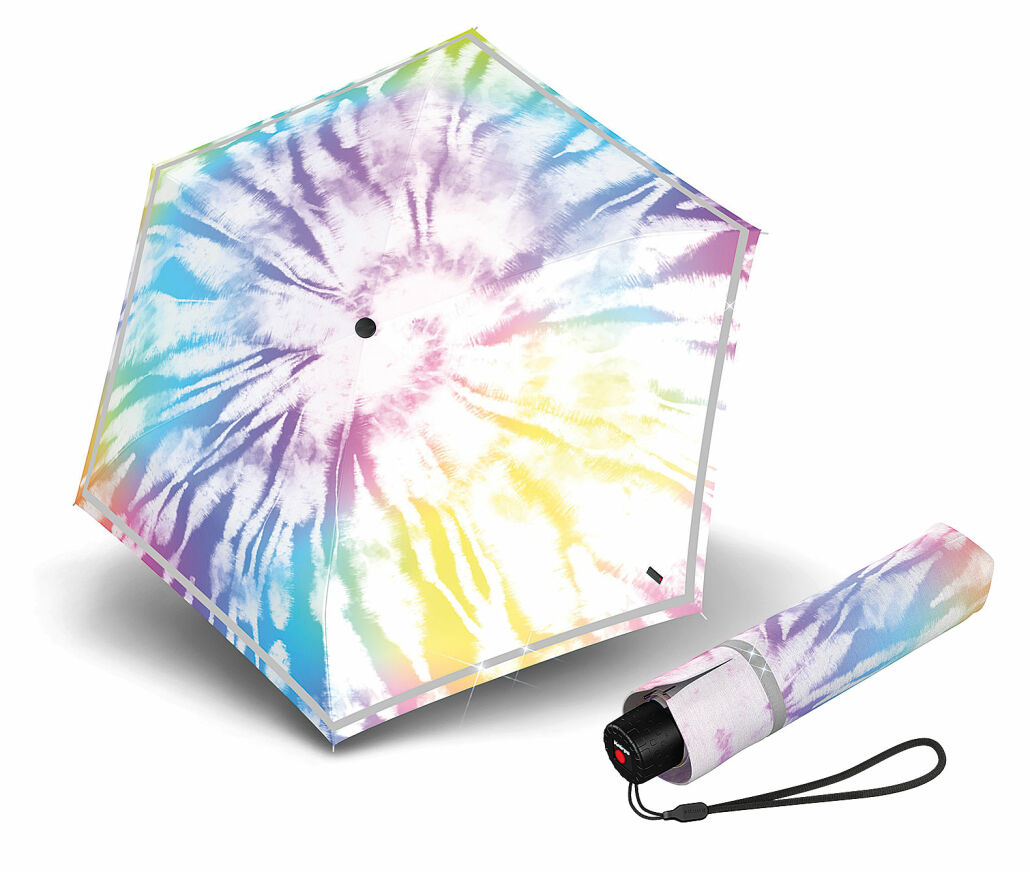 Gut gerüstet für Schulweg oder den Spaziergang bei Regen sind Kinder mit dem praktischen Taschenschirm Batik aus der Rookie Serie von Knirps. Mit leichten 205 Gramm lässt er sich gut handeln und fällt, wenn er sich klein macht, in der Tasche überhaupt nicht ins Gewicht. Mit einem Durchmesser von 90 Zentimetern bietet er außerdem ausreichend Schutz vor Regen. Das leuchtend bunte Batikmuster in allen Regenbogenfarben ist ein Hingucker, dank des umlaufenden, reflektierenden Bands ist der Schirm auch bei jedem Wetter gut sichtbar. In der Modellvariante A200 ist das Design Batik auch für Erwachsene zu haben, das heißt Klein und Groß sind an Regentagen gleichermaßen gut und bunt geschützt.