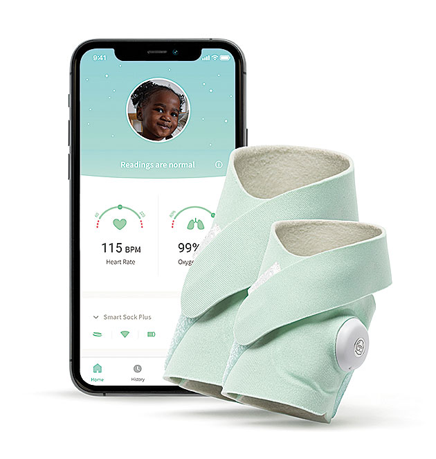 Bis zu einem Alter von fünf Jahren beziehunsgweise einem Gewicht von 25 Kilogramm ermöglicht die Smart Sock Plus Eltern, mittels moderner Technologie immer Gewissheit zu haben, dass es ihrem Nachwuchs gut geht. Dazu erfasst ein tragbarer Babymonitor Herzfrequenz, Sauerstoffgehalt, Schlafqualität und -dauer des Babys oder Kleinkinds. Die neuen Designs Wild Child und Forever Rainbow aus den Accessory Sock Sets sorgen modisch für Abwechslung.