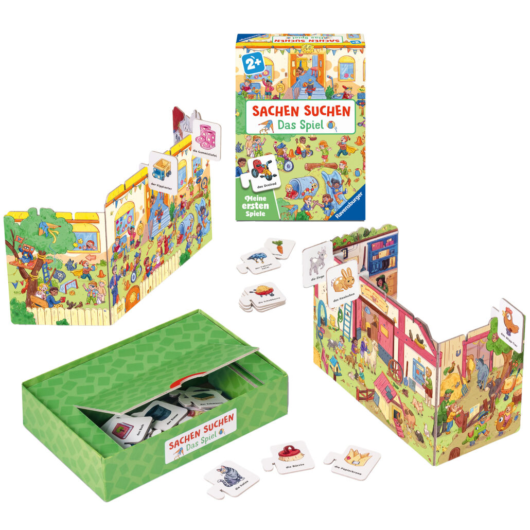 Wie in den beliebten „Sachen suchen“-Bilderbüchern von Ravensburger gilt es, in liebevoll-detailreichen Szenen bestimmte Gegenstände wiederzufinden. Dreidimensionale Kulissen machen die kleinen Geschichten lebendig. Was als Nächstes gesucht ist, dürfen die Kinder zufällig aus einer Truhe ziehen und direkt an der passenden Stelle befestigen. Neben dem Zuordnen fördert das Spiel auch sprachliche Entwicklung, Motorik und Konzentration. Eine Profivariante sorgt für noch längeren Spaß. Für Kinder ab zwei Jahren.