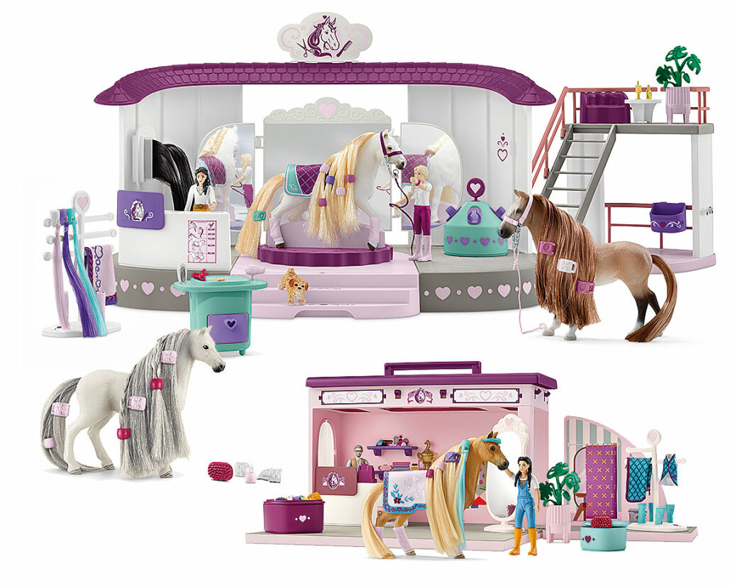 Frisierte Mähnen, gestylte Schweife und jede Menge Styling-Accessoires in bunten Farben, Beauty-Salon und Pop-Up-Boutique der neuen Horse Club-Produktlinie „Sofia’s Beauties“ bieten alles, was das schönheitsbewusste Pferdeherz begehrt. Dazu gibt es verschiedene Pferde-Sets wie beispielsweise die „Beauty Horse Vollblut Stute“ die „Beauty Horse Criollo Definitivo Stute“, die „Beauty Horse Quarter Horse Stute“ oder die „Beauty Horse Andalusier Stute“. Sie alle lassen sich im Beauty Salon oder in der Pop-up-Boutique verwöhnen.