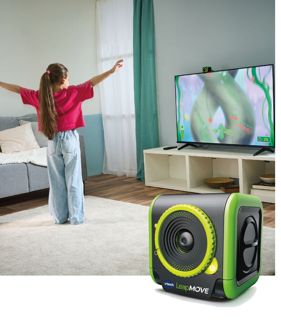 LeapMove von VTech ist eine innovative TV-Konsole für Kinder, die körperliche Aktivität in spannende Lernabenteuer verwandelt, entwickelt für Kinder im Alter von vier bis 12 Jahren. Sie vereint Lernen, Bewegung und Spielspaß in einem einzigartigen immersiven Spielerlebnis. Hier ist kein Controller mehr nötig. Dank innovativer Kameratechnologie erfasst LeapMove die Bewegungen der Kinder und lässt sich so kinderleicht bedienen. Bewegen, springen, tanzen, greifen … Jede Bewegung des Kindes steuert das Spiel, sodass die Kids vollständig in das Abenteuer eintauchen können. Auf dem Bildschirm sieht sich das Kind entweder selbst in Bewegung oder es schlüpft in die Rolle von fantastischen Tierfreunden. So wird es selbst zum Helden / zur Heldin des Spiels!