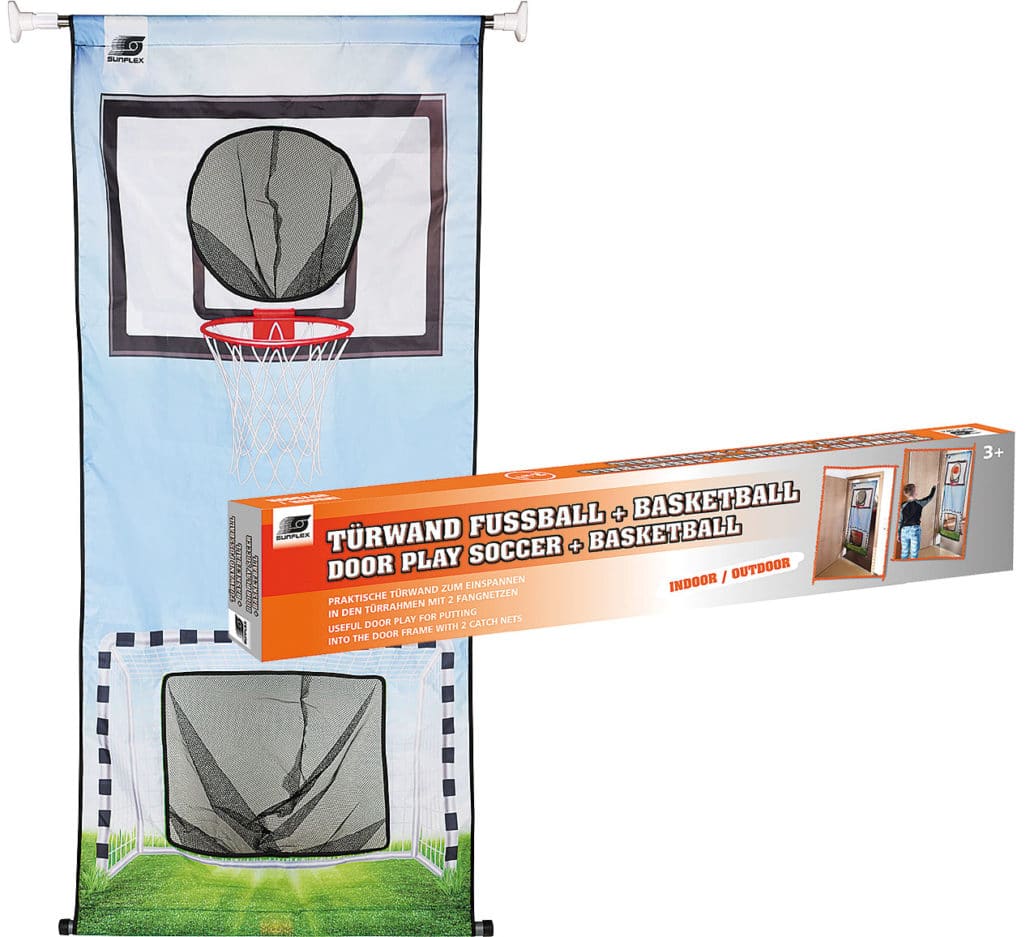 Kicken oder Körbe werfen – mit der sunflex Torwand Fußball + Basketball können Kinder ab sechs Jahren beide Sportarten üben. Die Torwand ist aus Polyester und dadurch für Indoor und Outdoor geeignet. Zwei Fangnetze sorgen dafür, dass die Bälle nicht überall umherfliegen. Passende Schaumstoffbälle sind separat erhältlich.