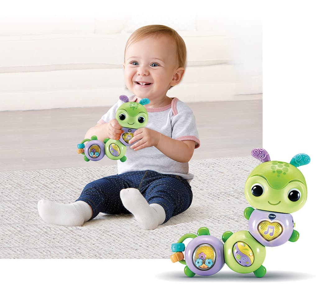 Bei der Drehspaß-Raupe von VTech ist der Name Programm: Die runden Glieder der niedlichen Raupe lassen sich drehen und geben ihr so eine andere Form. In Kombination mit den Rasselperlen und einer beweglichen Rolle am Körper der Figur werden so die motorischen Fähigkeiten der Kleinen geschult. Drückt man die leuchtende Herztaste, erklingen lustige Sätze, Melodien und gesungene Lieder, sodass das Baby auch in seiner visuellen und auditiven Wahrnehmung gefördert wird.